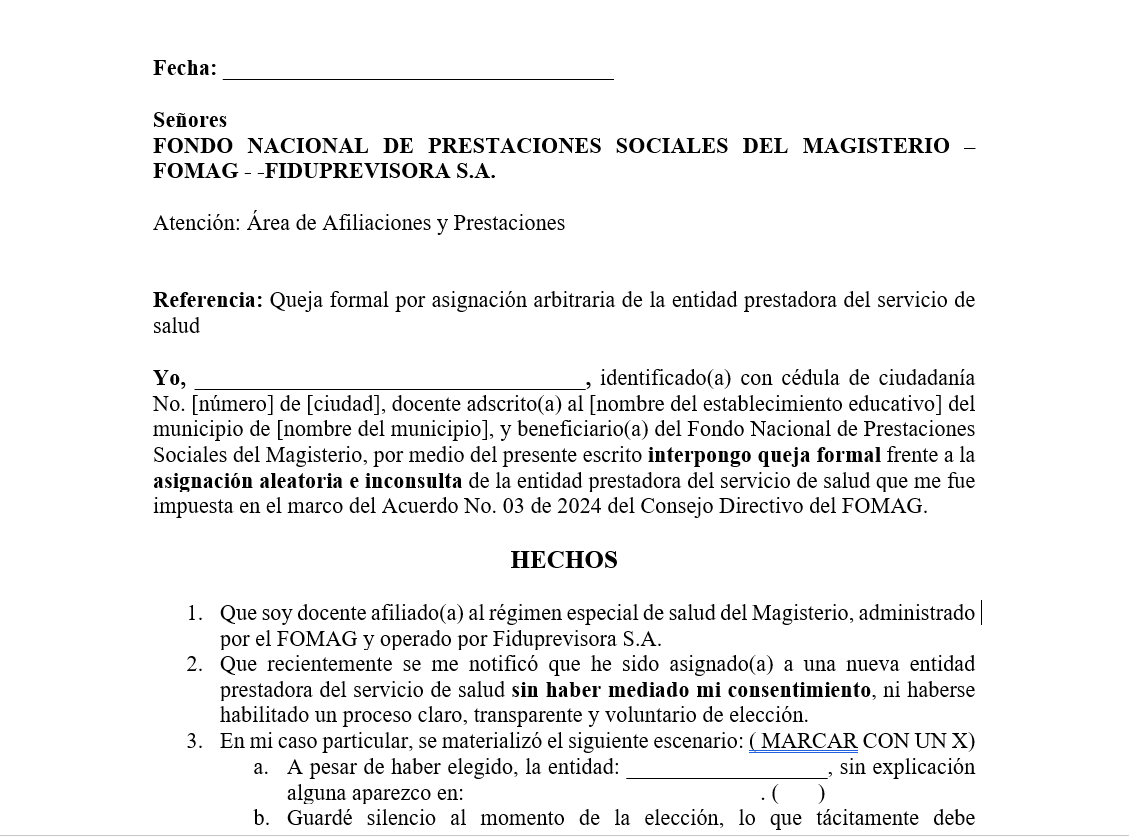 FORMATO : Queja formal por asignación arbitraria de la entidad prestadora del servicio de salud.
