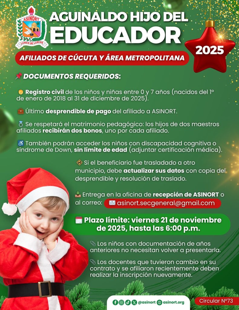 Llega el Aguinaldo Hijo del Educador 2025 Deja un comentario / Uncategorized / Por Asinort CIRCULAR No.73- Aguinaldo Hijo del Educador 2025 Cúcuta y Area MetropolitanaDescarga CIRCULAR No.74 – Aguinaldo Hijo del Educador DEPARTAMENTO 2025Descarga